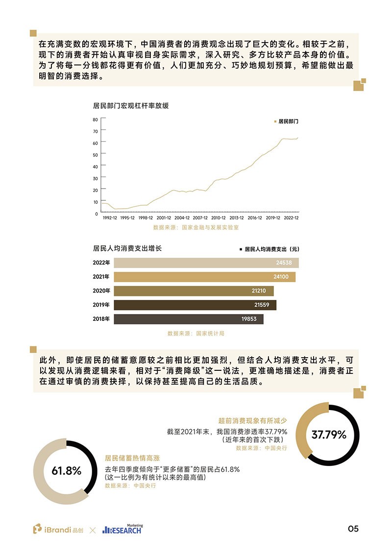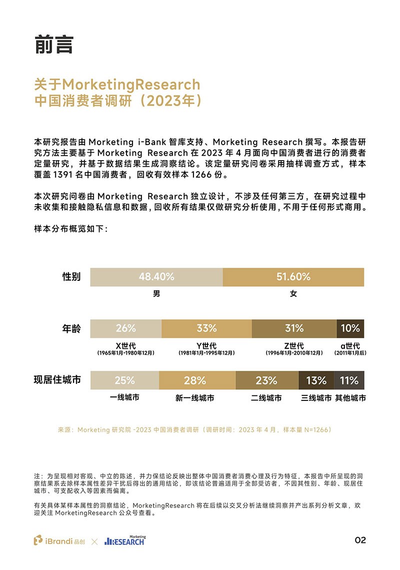 基于此,Morketing 旗下研究分析品牌 Morketing Research 希望通过深度剖析影响 消费者需求的核心驱动因素,探索 2023 年中国消费者消费理念和行为习惯的变化。为此, Morketing Research 于 2023 年 4 月面向中国消费者展开调研,并得出五大关键洞察 结论,整合并出品了此份《2023 中国消费者洞察报告》,以期在瞬息万变的环境中帮 助行业加深对当前中国消费者的了解,并力求为品牌方、营销方、服务方、学术方等不 同市场角色提供行业思考和理论支撑。