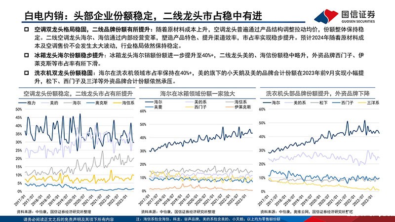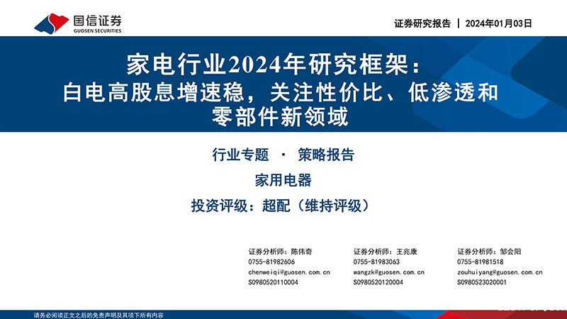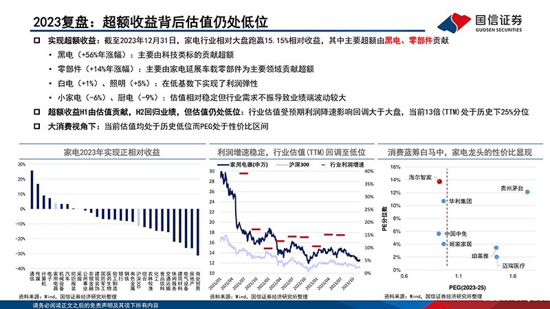 实现超额收益:截至2023年12月31日,家电行业相对大盘跑赢15.15%相对收益,其中主要超额由黑电、零部件贡献
