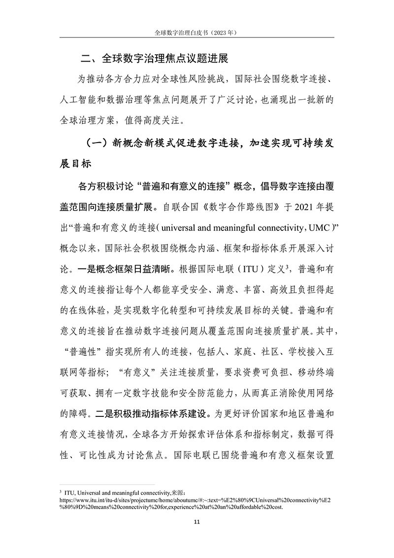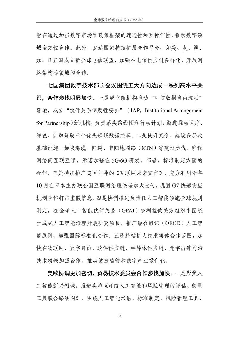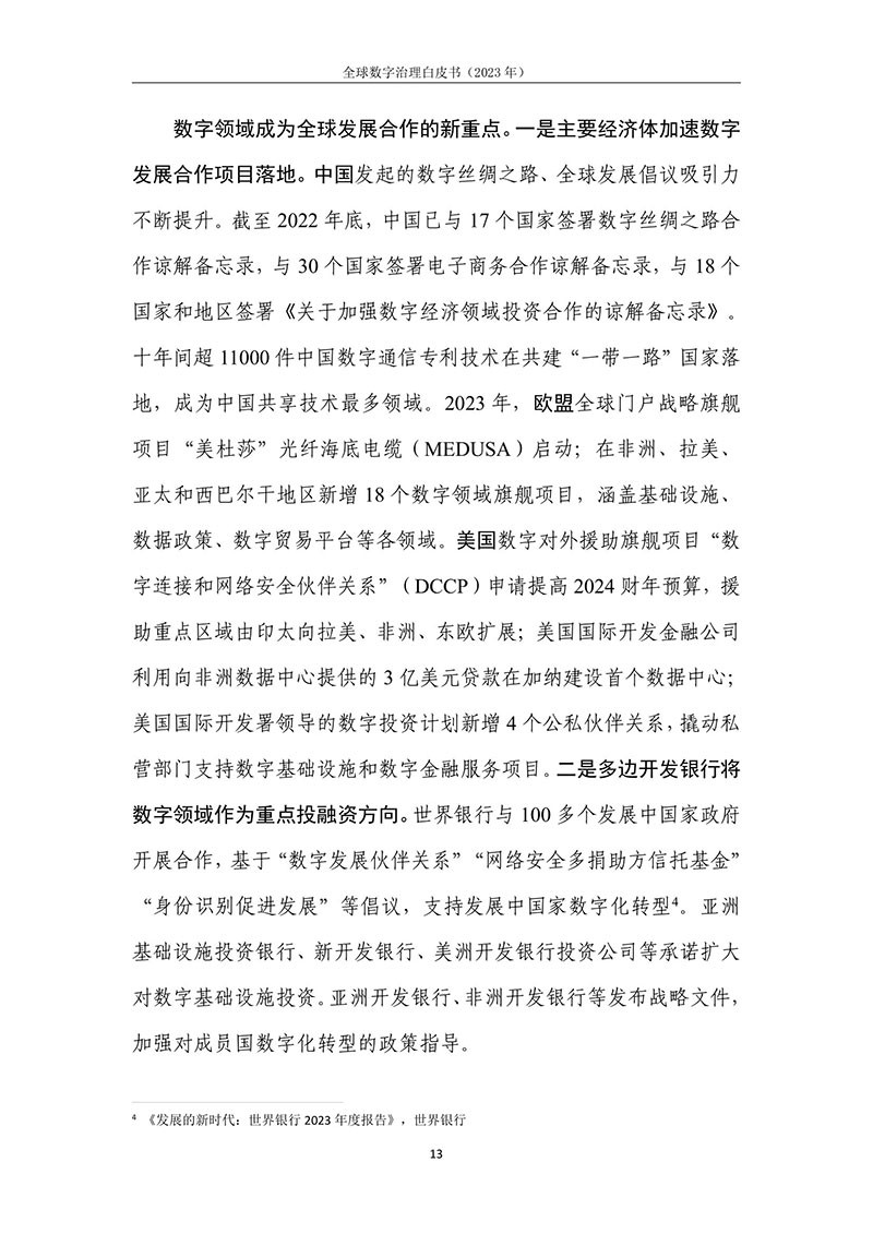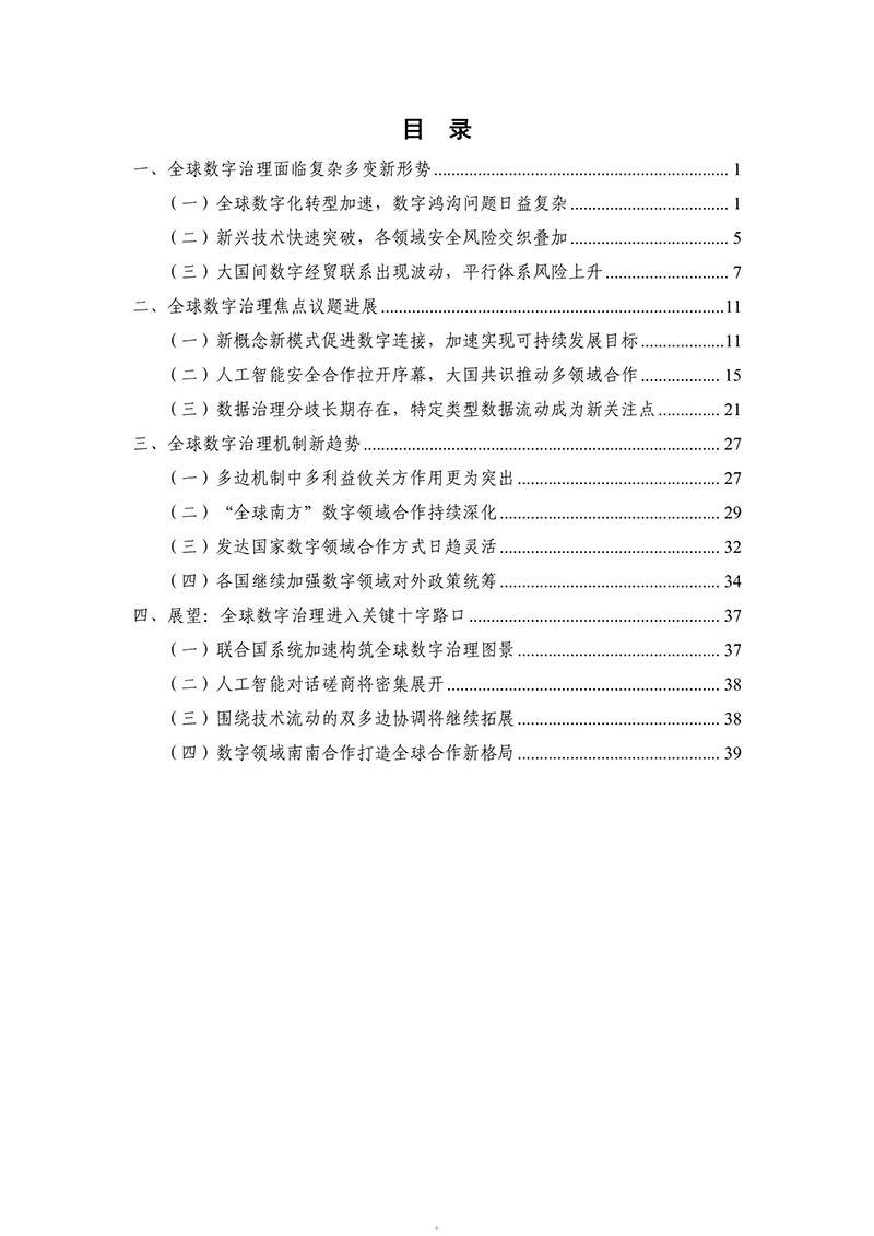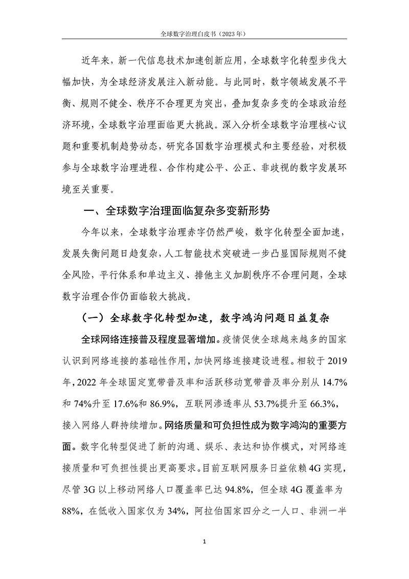 全球数字治理是各方为解决数字领域全球性问题而达成的塑造 各方行为预期的规范、规则、标准、程序及执行机制的过程。全球数 字治理应为数字领域全球性问题建立有效的矫正机制、护栏机制和协 调机制,积极应对发展结构失衡、抵御新兴技术风险并促进全球协商 合作。