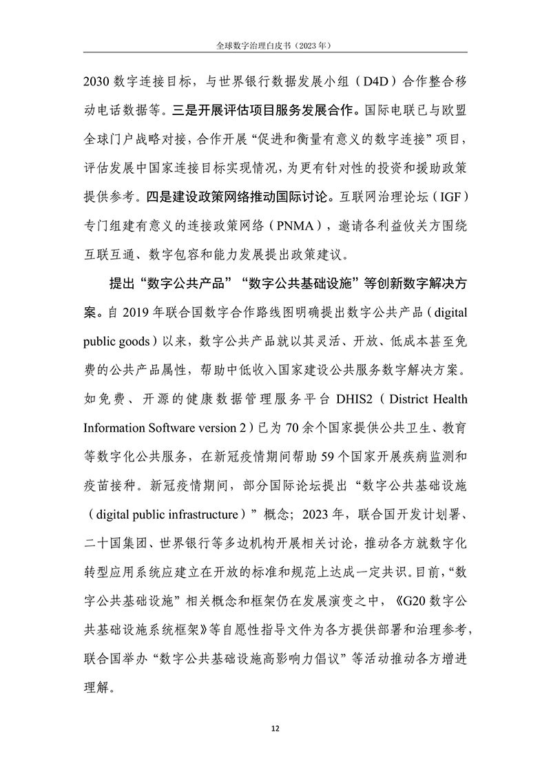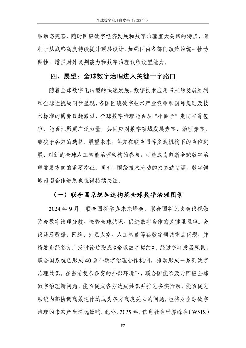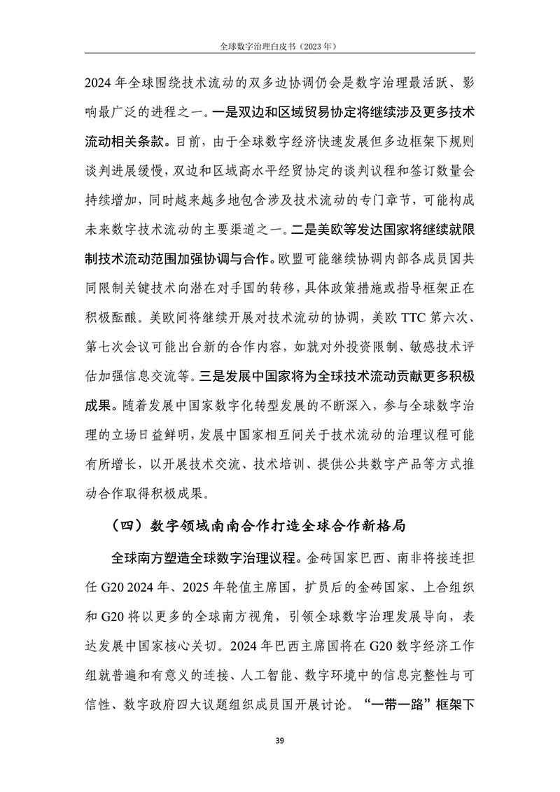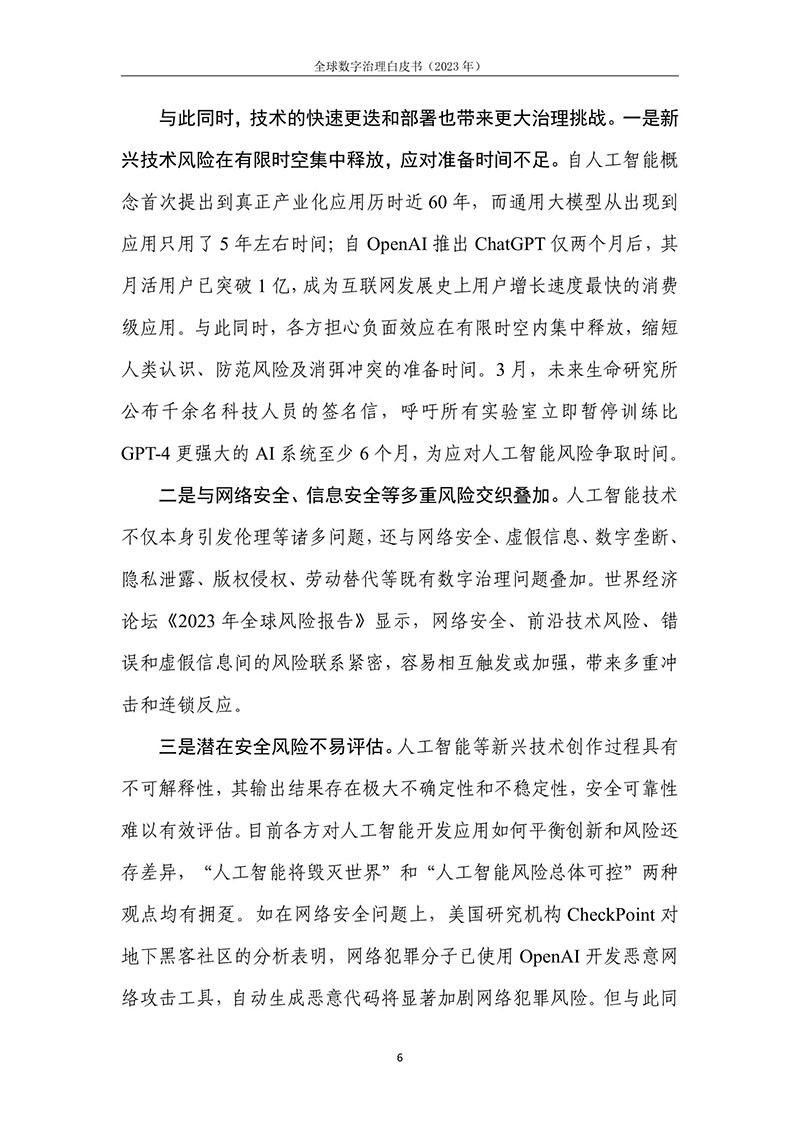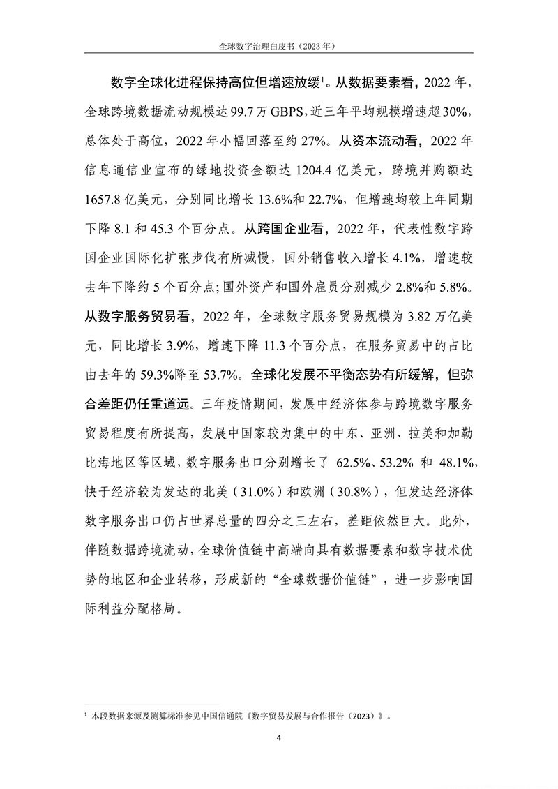 全球数字治理是各方为解决数字领域全球性问题而达成的塑造 各方行为预期的规范、规则、标准、程序及执行机制的过程。全球数 字治理应为数字领域全球性问题建立有效的矫正机制、护栏机制和协 调机制,积极应对发展结构失衡、抵御新兴技术风险并促进全球协商 合作。
