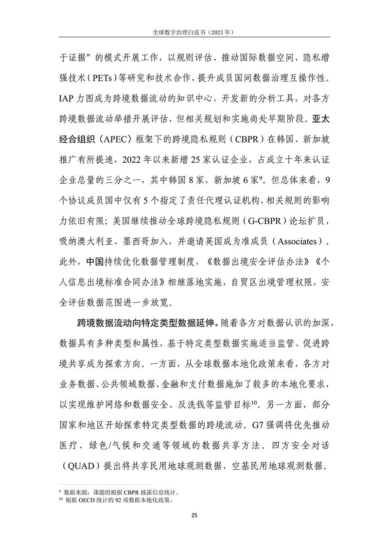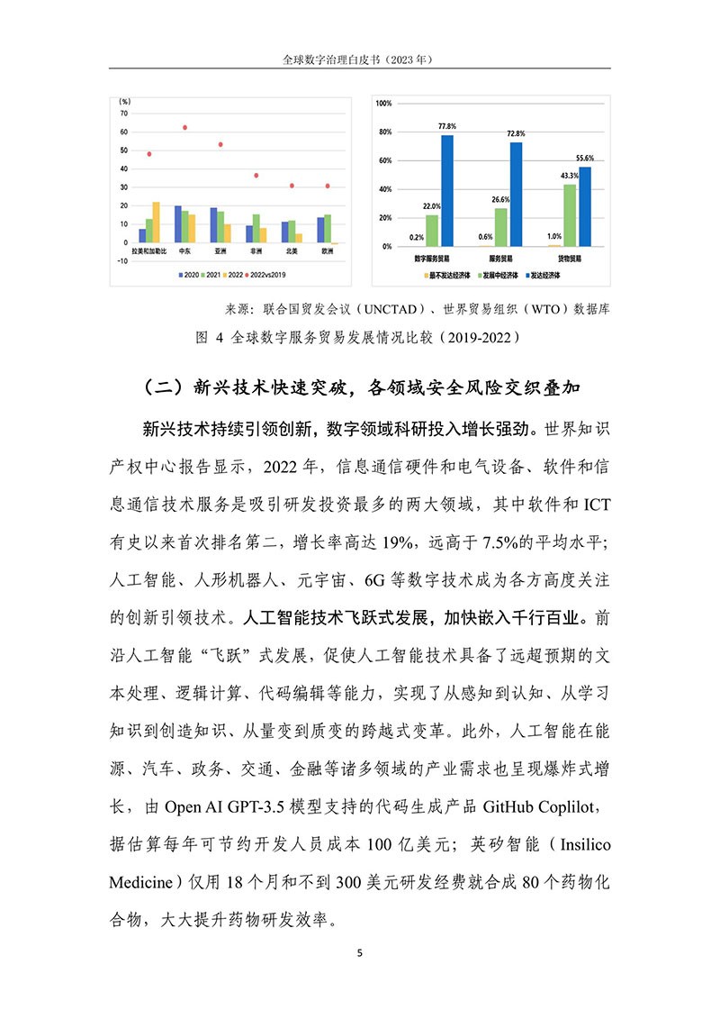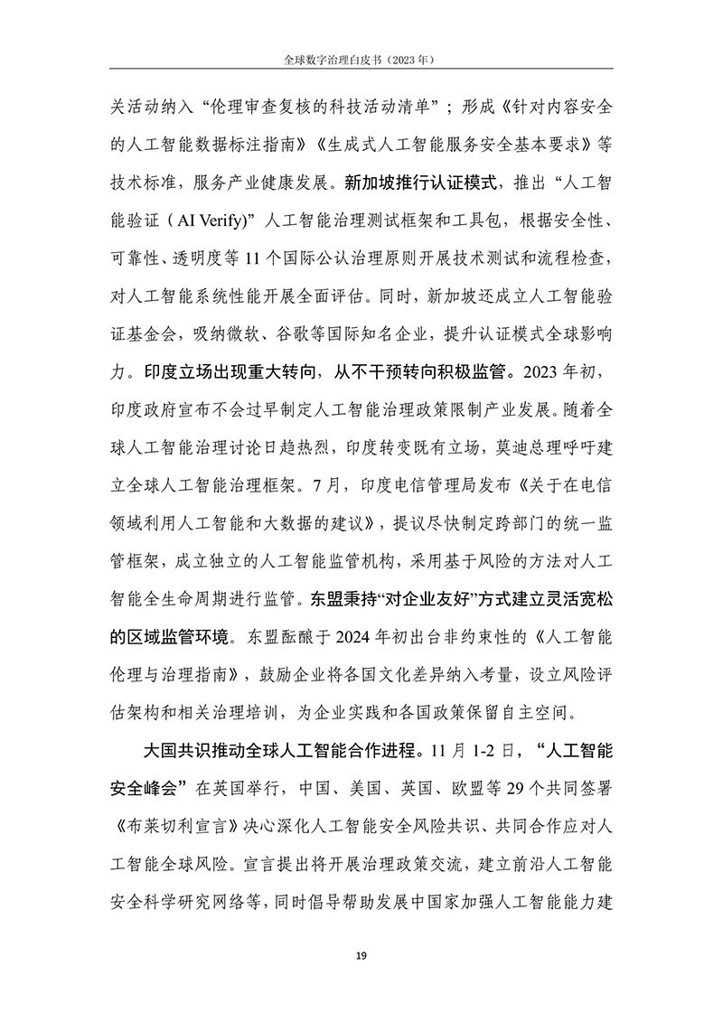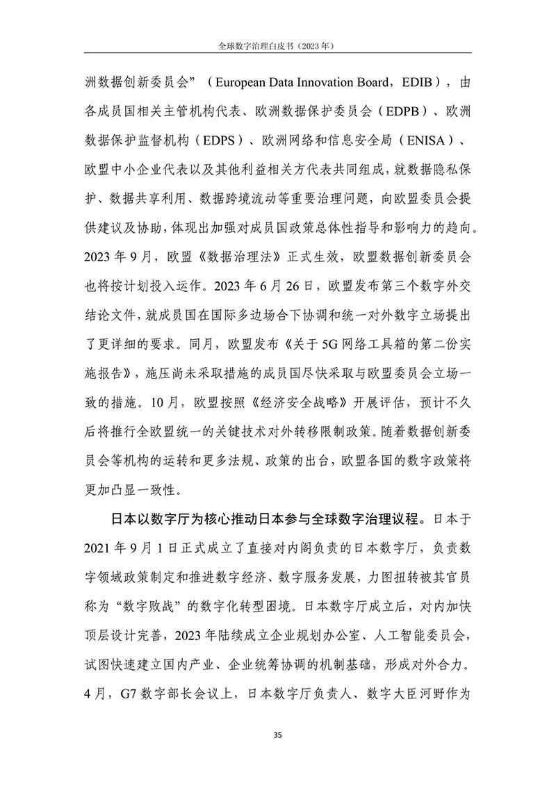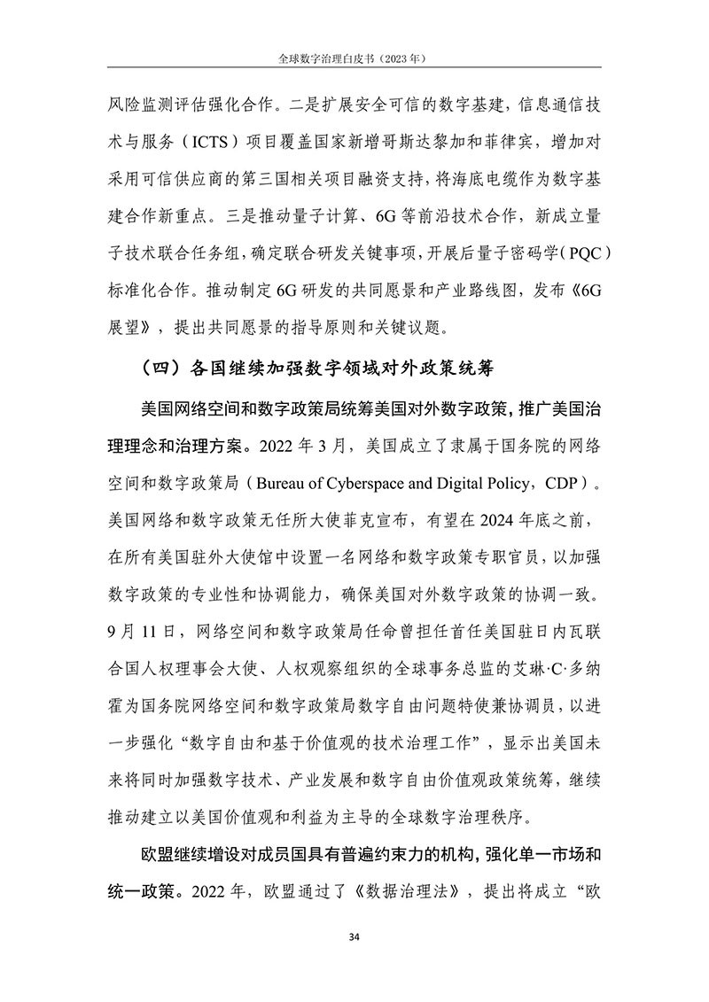 全球数字治理是各方为解决数字领域全球性问题而达成的塑造 各方行为预期的规范、规则、标准、程序及执行机制的过程。全球数 字治理应为数字领域全球性问题建立有效的矫正机制、护栏机制和协 调机制,积极应对发展结构失衡、抵御新兴技术风险并促进全球协商 合作。